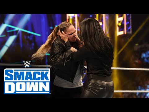 SmackDown’s nefarious WWE Official Sonya Deville attempts to take down The Baddest Woman on the Planet during Ronda Rousey’s face-to-face with her WrestleMania opponent, SmakDown Women’s Champion Charlotte Flair. Catch WWE action on Peacock, WWE Network, FOX, USA Network, Sony India and more.